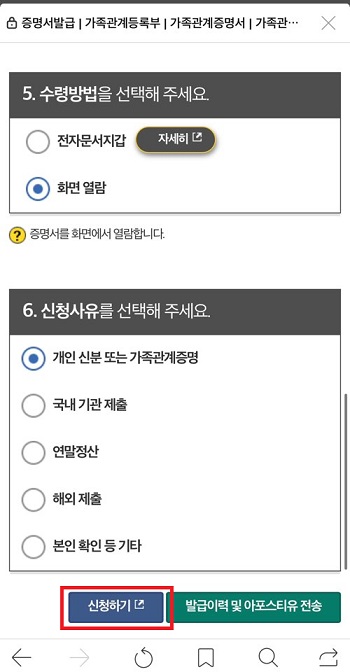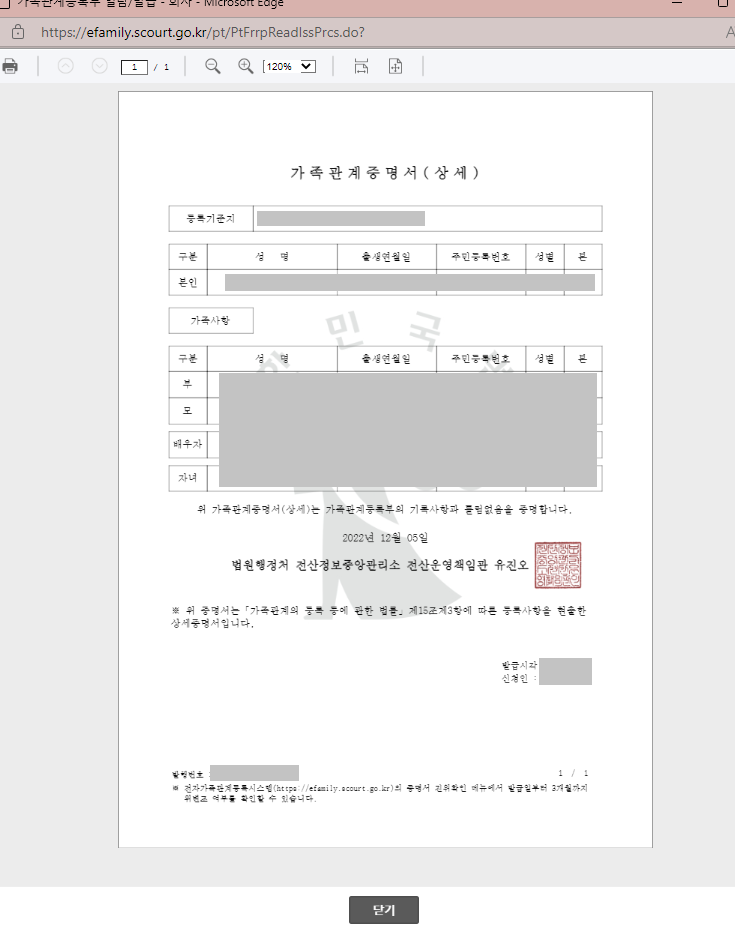 신기하게도 증명서 종류에 우리가 원하는 가족관계증명서 외에도 기본증명서와 혼인관계증명서를 모두 발급받을 수 있습니다. 즉, 이것들은 서로 다른 문서가 아니라 형식만 다른 같은 문서라는 것이죠.