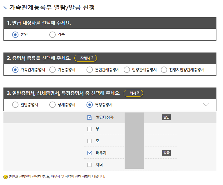 - 특정증명서를 선택하면 나를 중심을 직계존비속과 배우자를 선택할 수 있는 화면이 나오고, 이중에서 서류에 포함시킬 사람을 선택할 수 있습니다. 이는 제출처에서 부모자식관계를 요구하거나, 혹은 배우자의 관계의 확인을 요구하는 경우에 다른 사람의 정보를 오픈하지 않고도 서류를 제출하는 방법입니다.