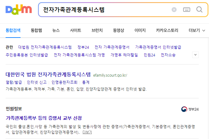먼저 포탈에서 가족관계증명서를 검색하시면 전자가족관계등록시스템으로 연결되는 홈페이지가 뜹니다.
