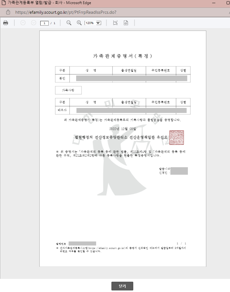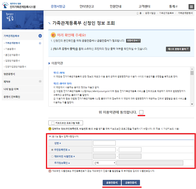 대법원에서 만들고 운영하고 있는 시스템으로 가족관계증명서, 기본증명서, 혼인관계증명서, 제적부등본, 제적부초본 등의 서류를 발급받을 수 있습니다. 이외에도 기존에 법원에서 수행하던 다양한 업무를 전자적으로 수행할 수 있도록 잘 만들어 놓은 시스템입니다.