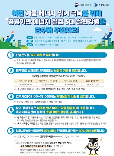 산업통상자원부(장관 이창양, 이하 산업부)는 에너지 위기 극복을 위한 공공부문의 강도 높은 에너지 절감 조치인 공공기관 에너지사용의 제한에 관한 공고(산업부 공고 제2022-766호)를 시행합니다.