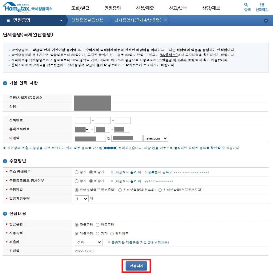 3. 국세 납세증명서 오프라인