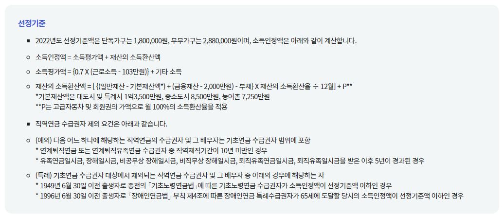 - 1949년 6월 30일 이전 출생자로 종전의 「기초노령연금법」에 따른 기초노령연금 수급권자가 소득인정액이 선정기준액 이하인 경우