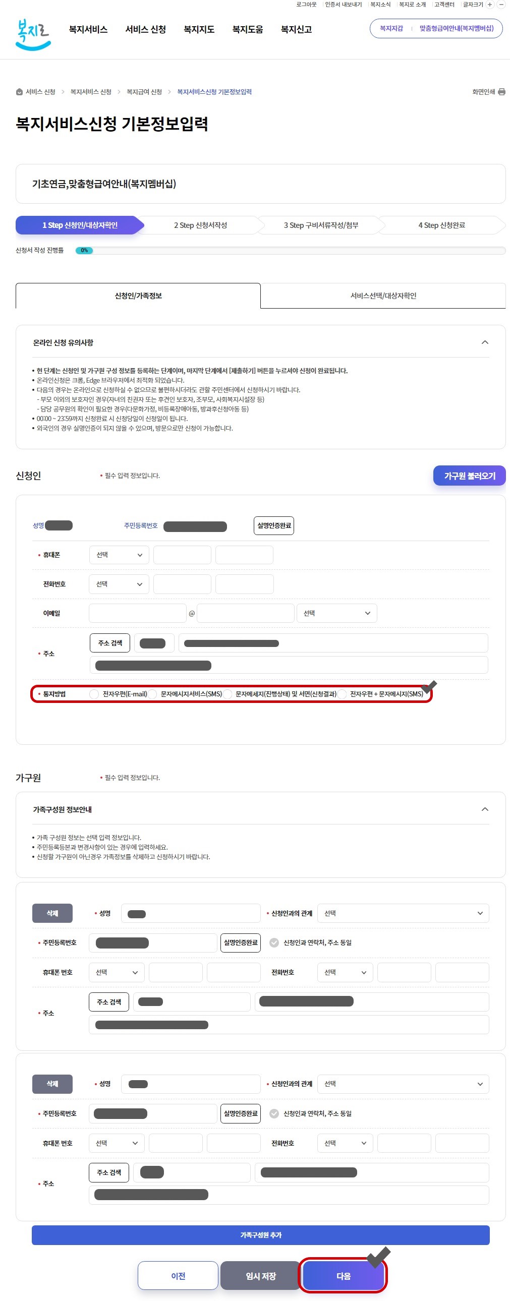 신청인 및 가족구성원의 정보를 입력하고 다음을 누르시면 신청 자격이 되시는 분들은 서비스 신청을 계속 진행하시면 됩니다.