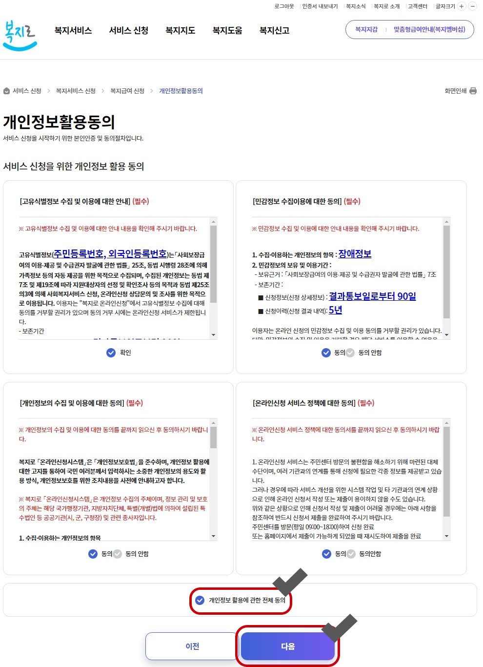 4. 개인정보 활용에 관한 동의를 모두 눌러주시고 다음으로 넘어갑니다.