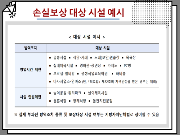 * 소상공인의 손실에 대한 사전 보상 및 방역지원금 대상 요약