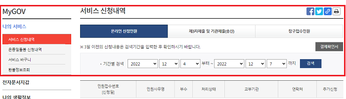 해당 메뉴는 마이페이지와 비슷한 성격으로 접속하면 ‘서비스 신청내역’을 확인할 수 있고, 기간별 검색을 통해 재발급을 요청할 수 있습니다.