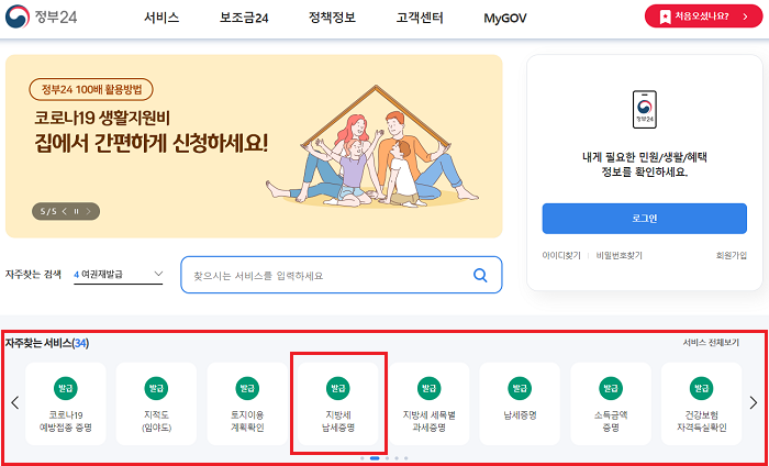 2) 자주찾는 서비스에서 지방세 납세증명 찾아 클릭하기