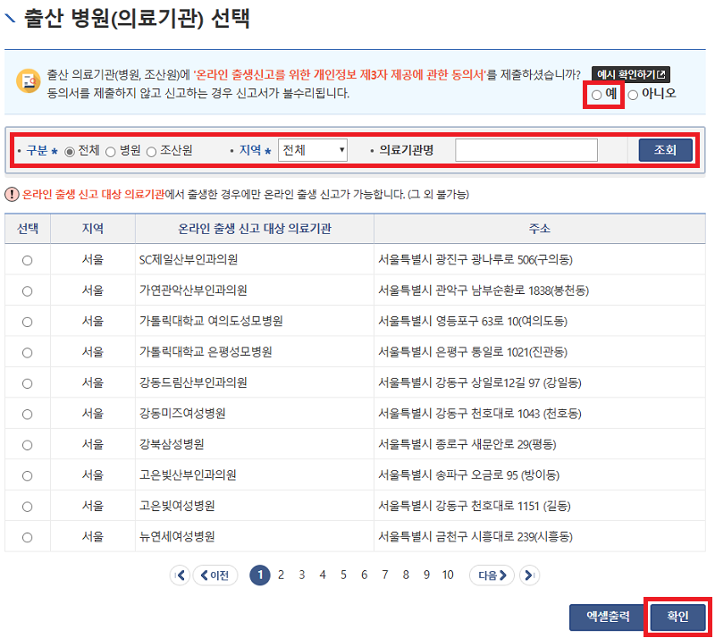3) 출산 병원(의료기관)을 선택하고 출산 의료기관 온라인 출생신고를 위한 동의서 제출을 '예'로 체크한 뒤 확인을 클릭합니다.