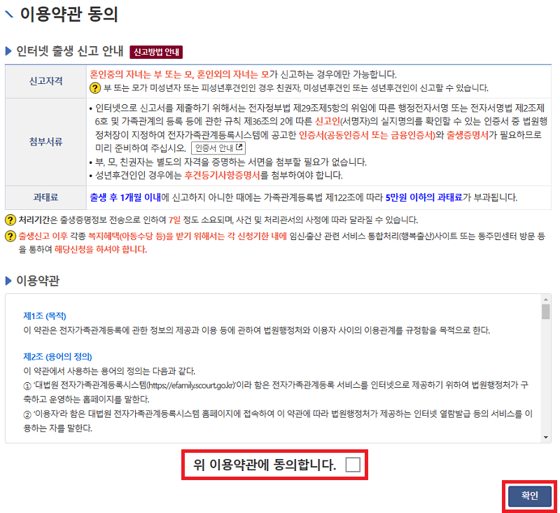 4) 이용약관에 동의를 한 뒤 확인을 클릭합니다.