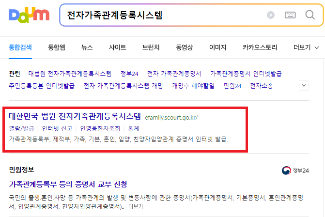 1) 포털에서 전자가족관계등록시스템을 검색하여 홈페이지에 접속합니다.