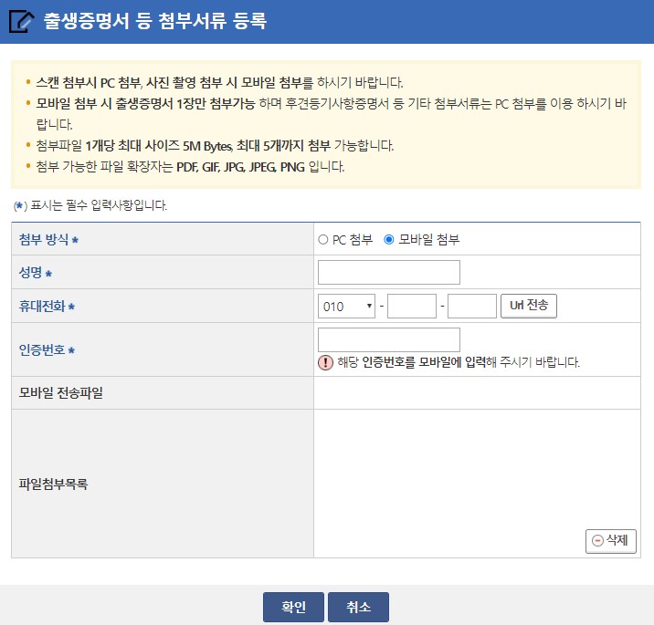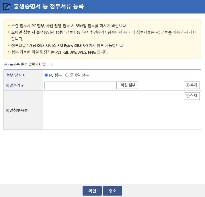 6) 준비해둔 구비서류를 등록합니다. 첨부서류 등록은 PC 또는 모바일로 가능하오니 편하신 방법으로 하시면 됩니다.