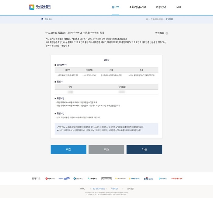 4. 카드 포인트 통합조회 및 계좌입금 서비스 이용을 위한 위임 동의