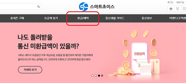 • 법인 가입자, 만14세 미만 가입자, 외국인 가입자, 가명 가입자는 스마트초이스에서는 미환급액 조회가 제한되므로 해당 통신사 고객센터로 문의하시기 바랍니다.