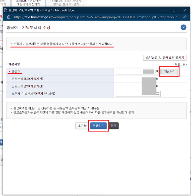 Step.03 에서는 예상세액을 입력하는 내역을 보여줍니다. 여기서 마이너스로 뜨는 내역은 환급받을 세금이고 플러스로 뜨는 내역은 추가로 납부해야 할 세금입니다.