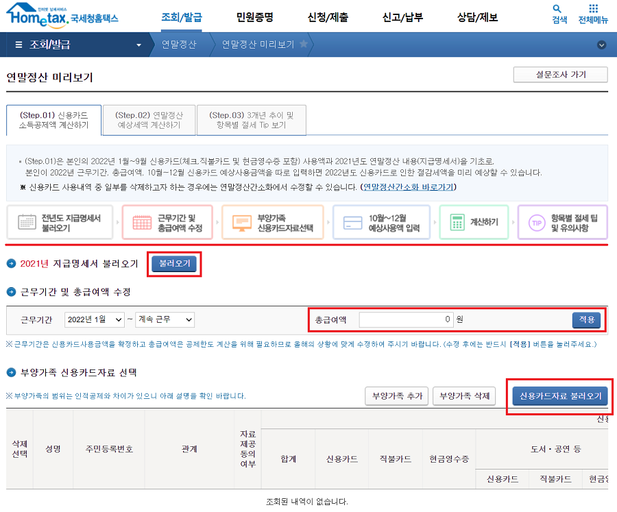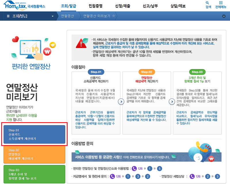 3) 연말정산 미리보기에서 Step.1 신용카드 소득공제액 계산하기를 클릭합니다.