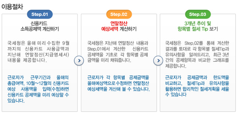 연말정산 미리보기 서비스란 국세청이 수집한 올해 1월부터 9월까지 사용하신 신용카드 사용금액과 지난해 연말정산 내용을 기초로 하여 제공하며, 근로자의 총급여 및 각종 공제항목을 근거로 돌려받거나 추가로 세금을 납부해야할 연말정산 예상세액을 확인할 수 있는 서비스입니다.