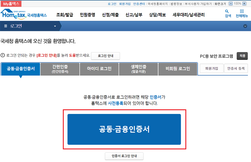 1) 홈택스에 접속하시면 로그인부터 합니다.