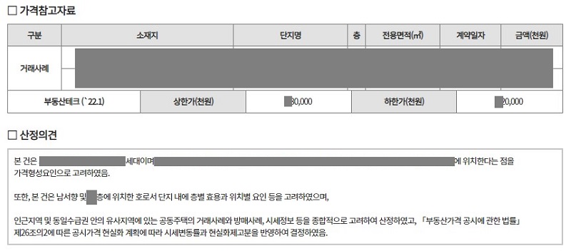 산정기초자료를 클릭하면 가격참고자료 및 산정의견도 확인할 수 있습니다.