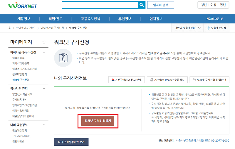 2) 워크넷 구직신청하기를 클릭하고 내용을 작성한 후 구직신청을 완료해주세요