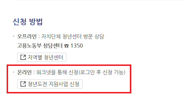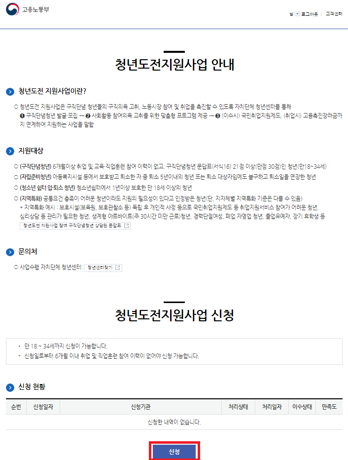 구직신청이 완료된 후 청년도전 지원사업을 찾아보겠습니다.