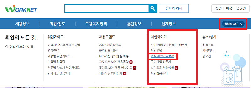 3) 워크넷 메뉴 오른쪽에 취업의 모든 것-취업이야기 하단의 핵심 취업지원정책을 클릭합니다.