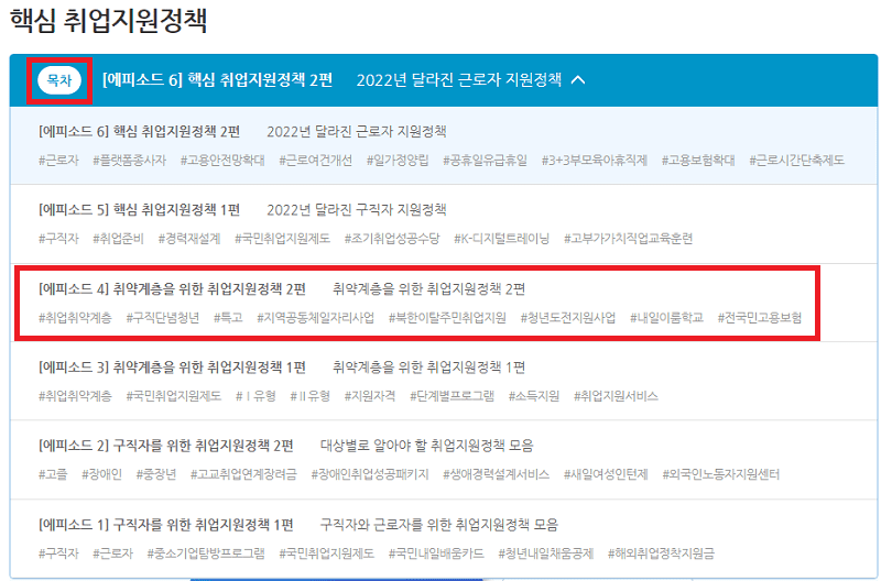 4) 목차에서 [에피소드 4] 취약계층을 위한 취업정책지원 2편을 클릭합니다.