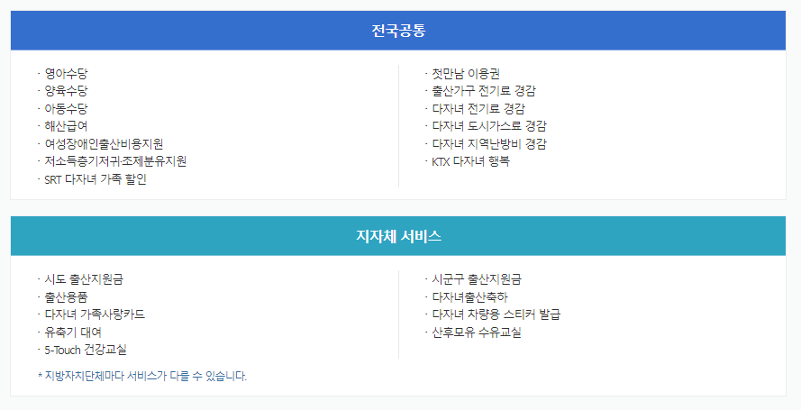 양육수당, 다자녀 공공요금 감면 등 전국 공통서비스 7종 및 출산지원금 등 지자체 개별 서비스를 한번에 신청할 수 있는 서비스입니다. (지자체 개별서비스는 지자체에 따라 다릅니다.)