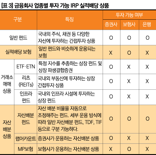 - 증권사 IRP : 거래소 매매 상품 ETF, ETN, 리츠(REITs), 인프라펀드 투자 가능, 일반 펀드, 자산배분 펀드, 랩어카운트
