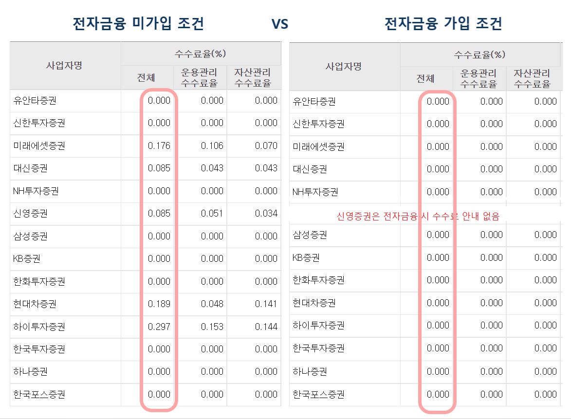 증권사는 전자금융 가입 유무(비대면 계좌개설)에 따라 수수료가 발생합니다.