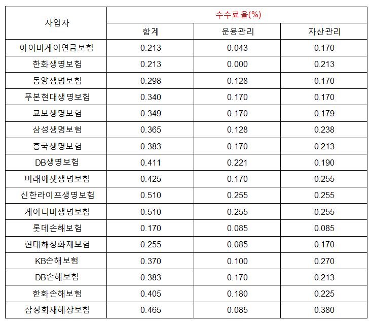 보험사별 IRP 퇴직연금 수수료