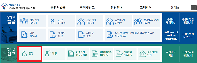 대법원에서 만들고 운영하고 있는 시스템으로 기존에 법원에서 수행하던 다양한 업무를 전자적으로 수행할 수 있도록 잘 만들어 놓은 시스템입니다. 보통 많은 분들이 가족관계증명서, 기본증명서, 혼인관계증명서, 제적부등본, 제적부초본 등의 서류를 발급받을 때 이용하는 데 출생신고도 인터넷으로 할 수 있습니다.
