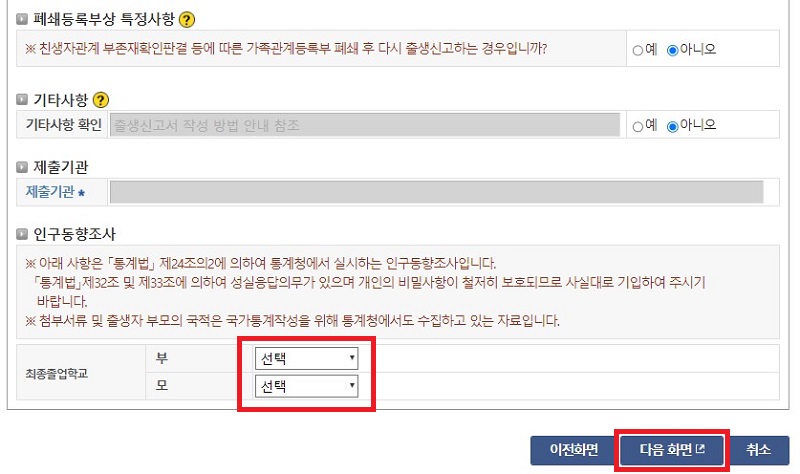 5) 출생신고서를 작성한 뒤 다음 화면을 클릭합니다.